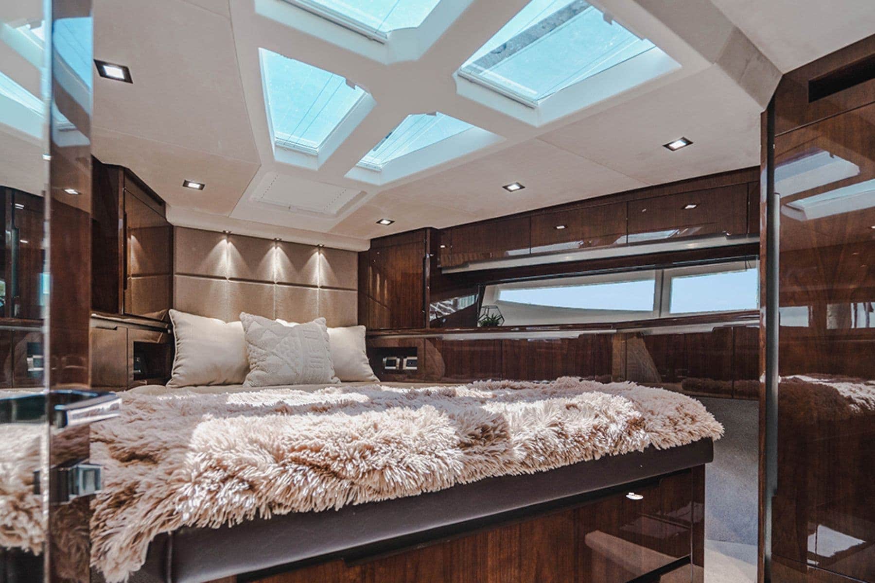 The result is a flybridge yacht with the sleek profile of a sports cruiser. You also get a retractable sunroof over the lower helm area, which gives a more open feel for day cruises.