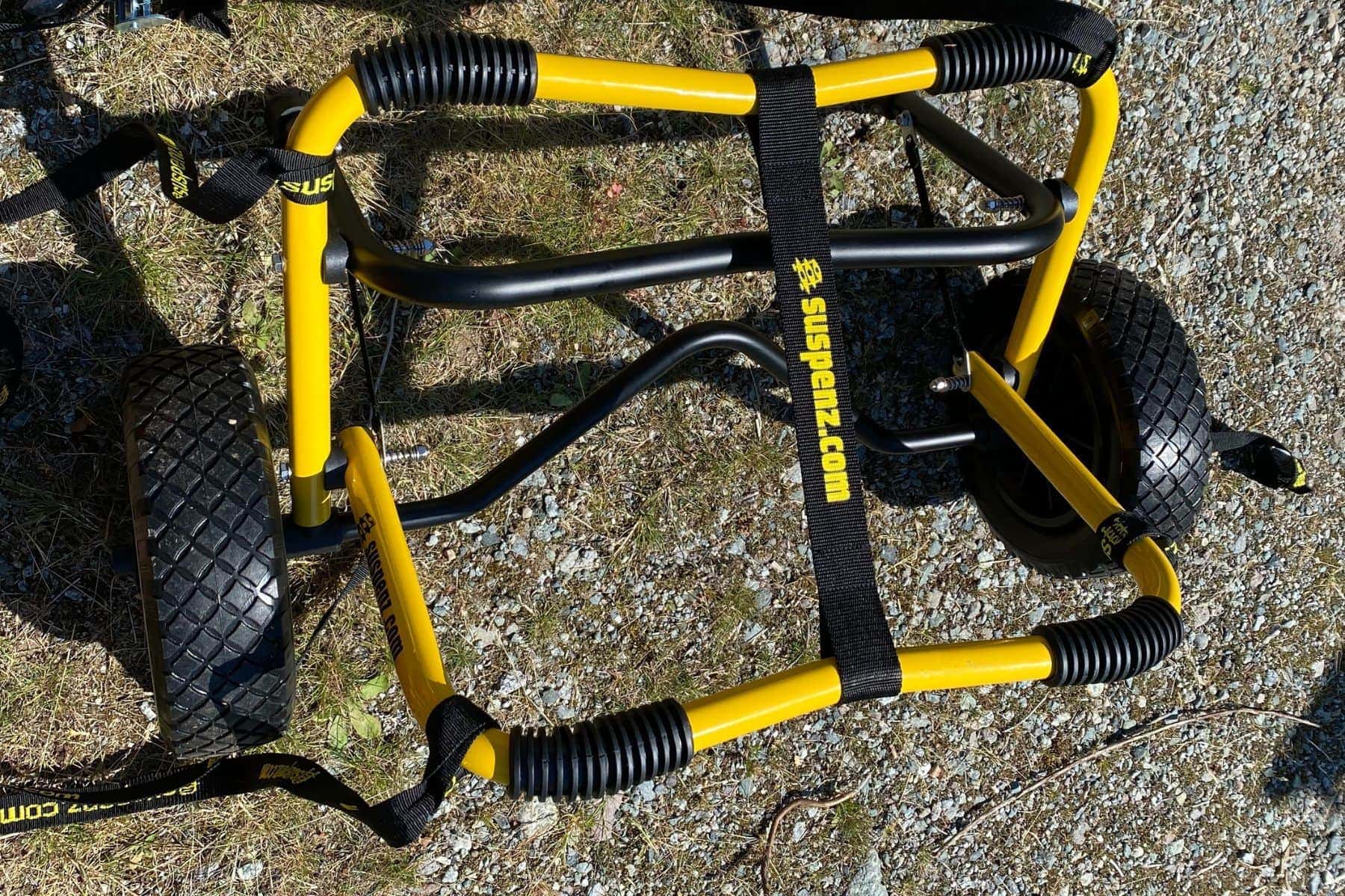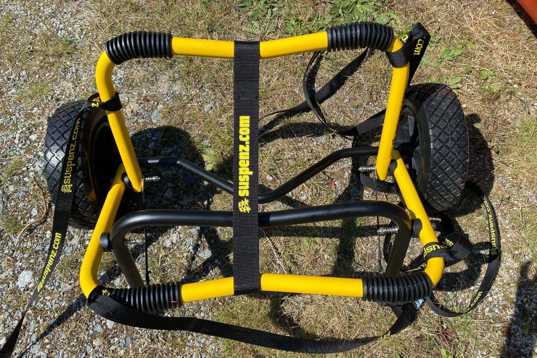 The Suspenz Heavy Duty Airless Cart is a top-of-the-line, robust kayak cart built to carry the load of a fully packed and weighted kayak. The strong powder-coated aluminum frame and stainless steel hardware make this kayak cart virtually indestructible.